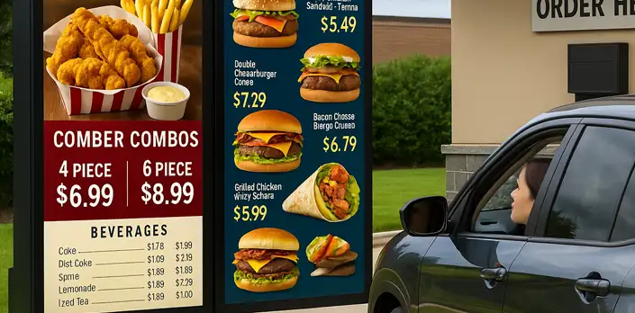 Drive thru displays extend restaurant digital signage outdoors. These screens are built for visibility in sunlight, rain, and snow. Single and double-sided kiosks present menus, combo deals, and upsell opportunities clearly to drivers. Restaurants adjust pricing and promotions instantly to reflect inventory or daily specials. High resolution visuals reduce miscommunication at the order point, improving accuracy and speed. Drive thru digital signage solutions for restaurants deliver faster service, shorter lines, and more consistent customer satisfaction.